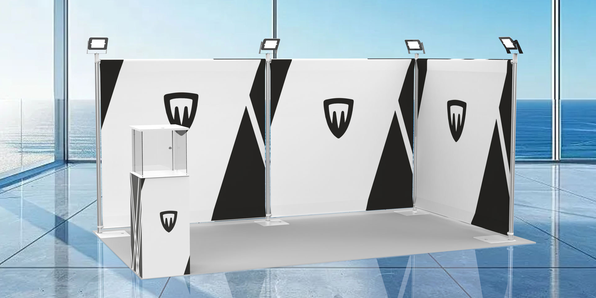 Questo modello di stand componibile è interessante qualora lo spazio da allestire è piccolo perché occupa solo 5 cm in profondità, oppure quando si vuole creare lo stand di grandi dimensioni in tempi stretti.