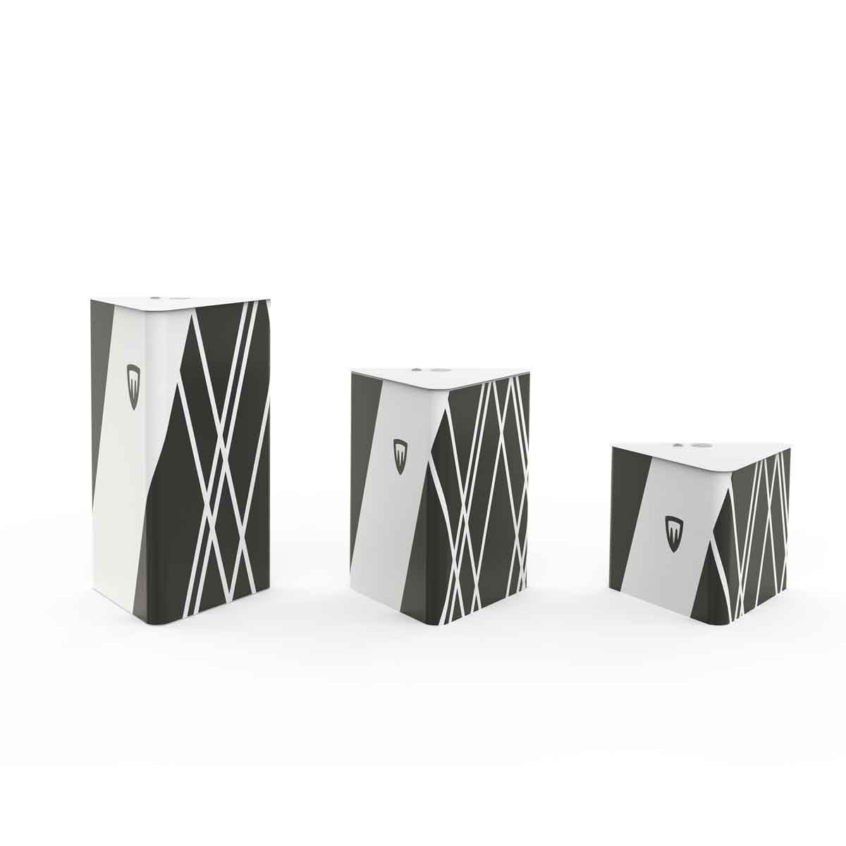 Utilizza l’espositore quadrato portatile in modo alternativo, abbinando le diverse altezze dando più movimento al tuo stand e vestilo con una grafica accattivante.